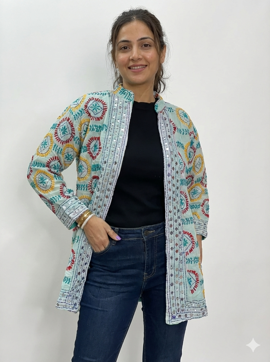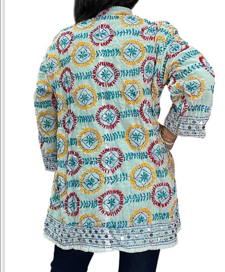 Casaco leve com bordados circulares e espelhos decorativos, em estilo artesanal vibrante e elegante.